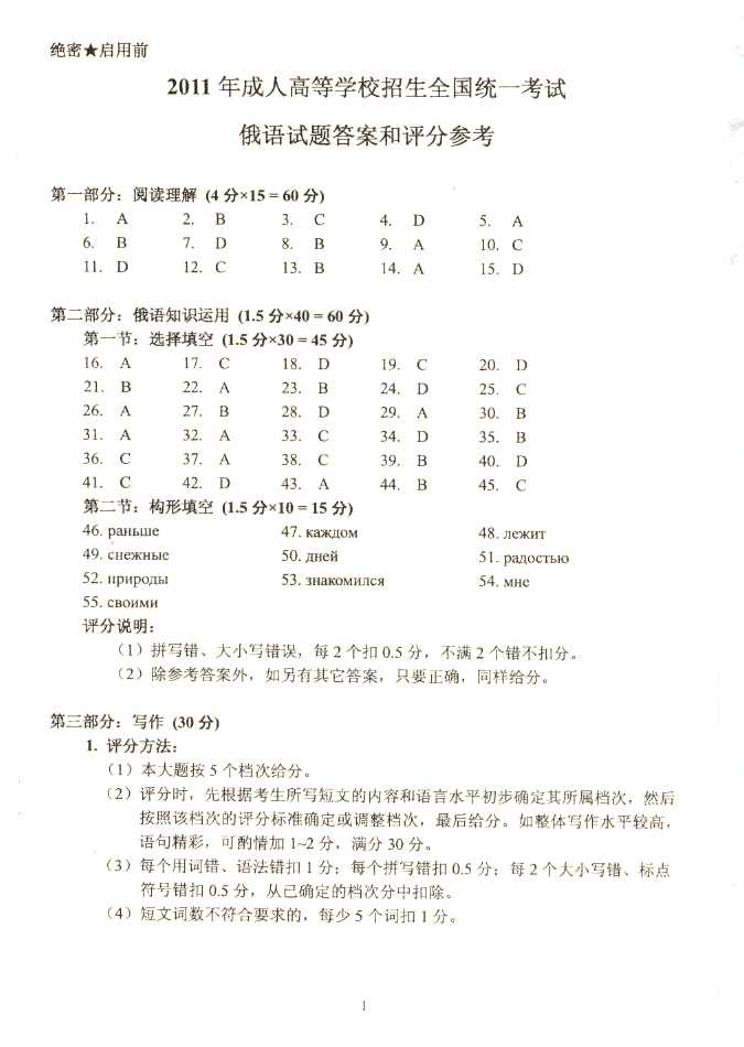 2011年全国成人高考高起点《俄语》试题及答案