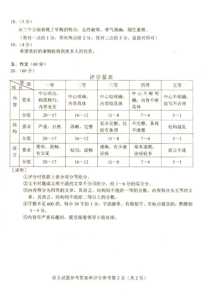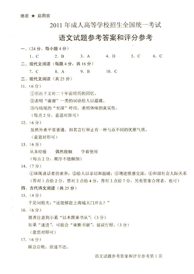 2011年全国成人高考高起点《语文》试题及答案
