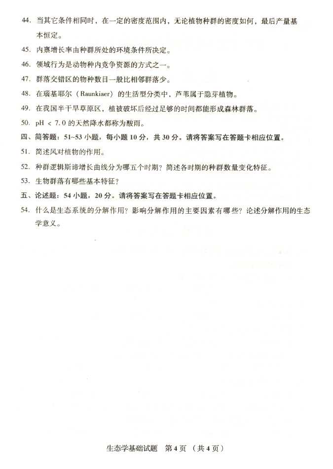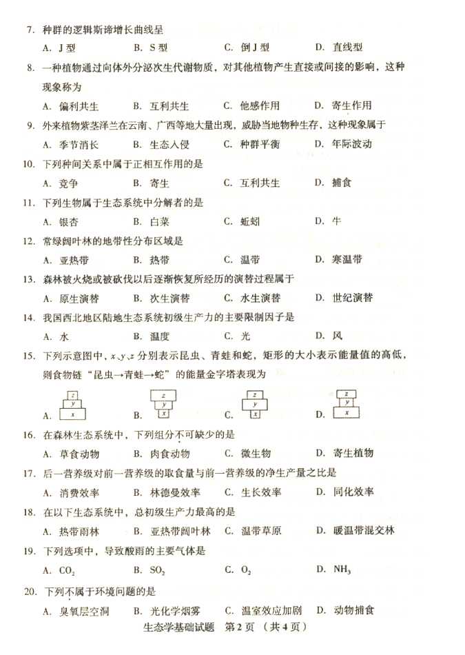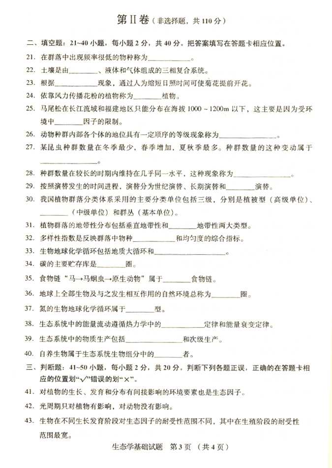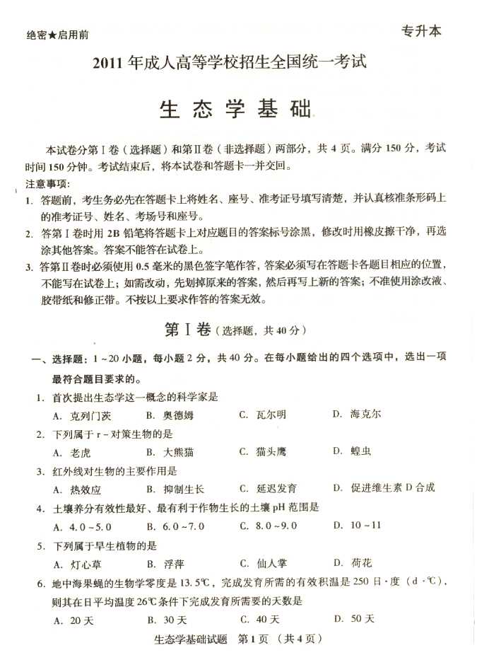 2011年全国成人高考专升本《生态学基础》试题及答案