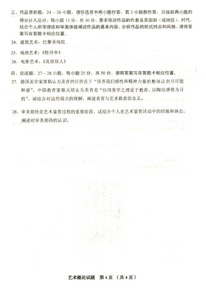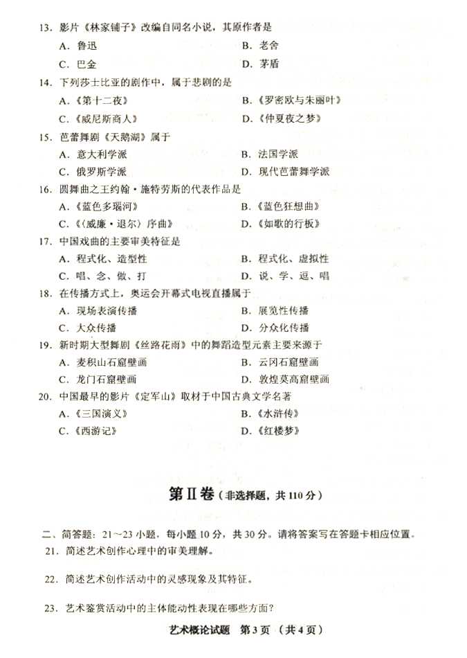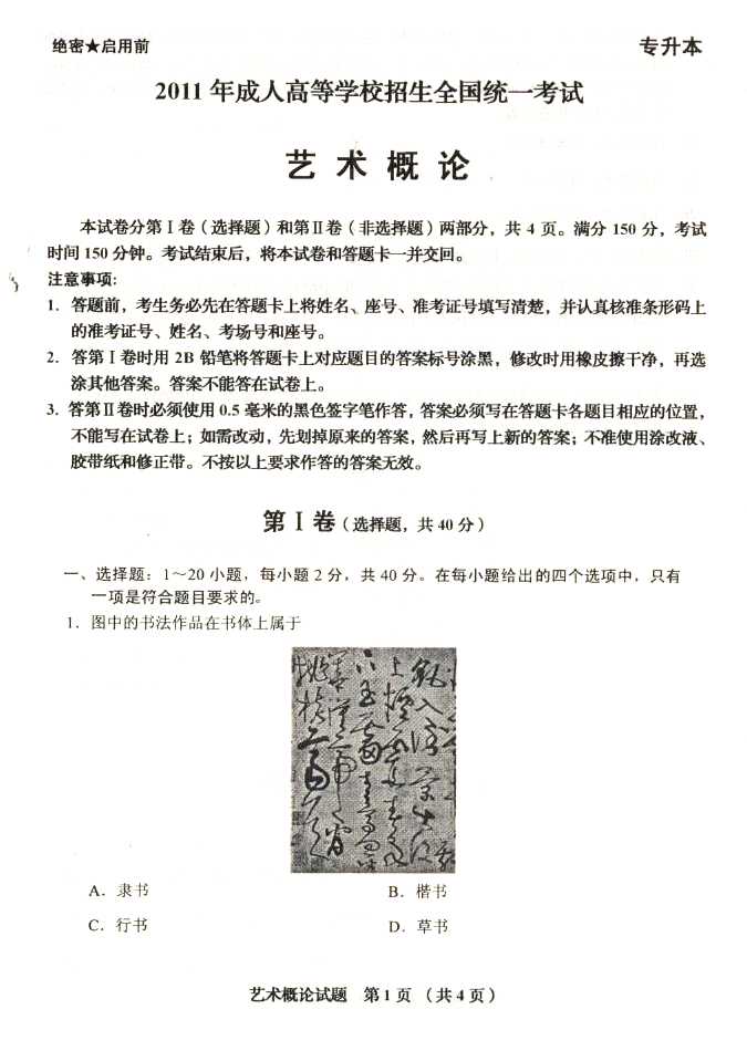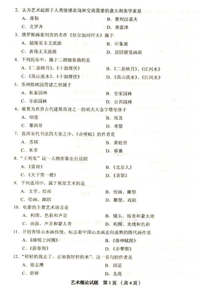 2011年全国成人高考专升本《艺术概论》试题及答案