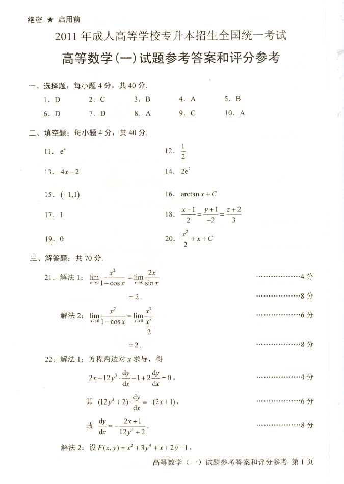 2011年全国成人高考专升本《高等数学(一)》试题及答案