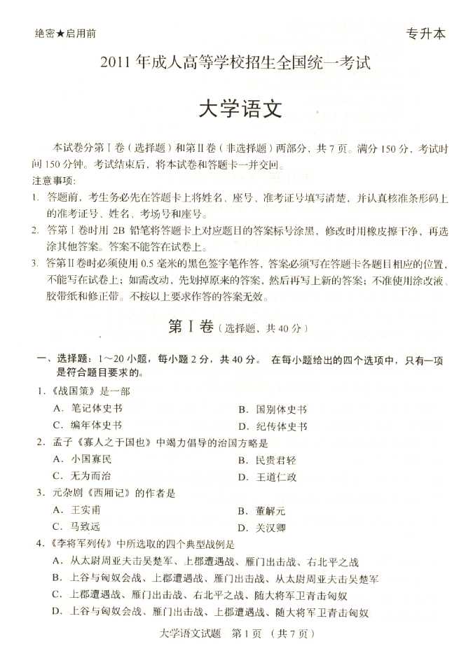 2011年全国成人高考专升本《大学语文》试题及答案