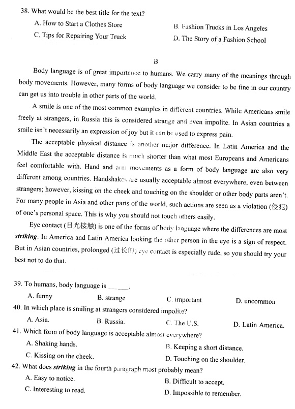 2014年成人高考高中起点《英语》真题及答案