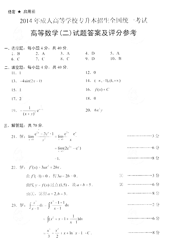 2014年成人高考专升本《高等数学(二)》真题及答案