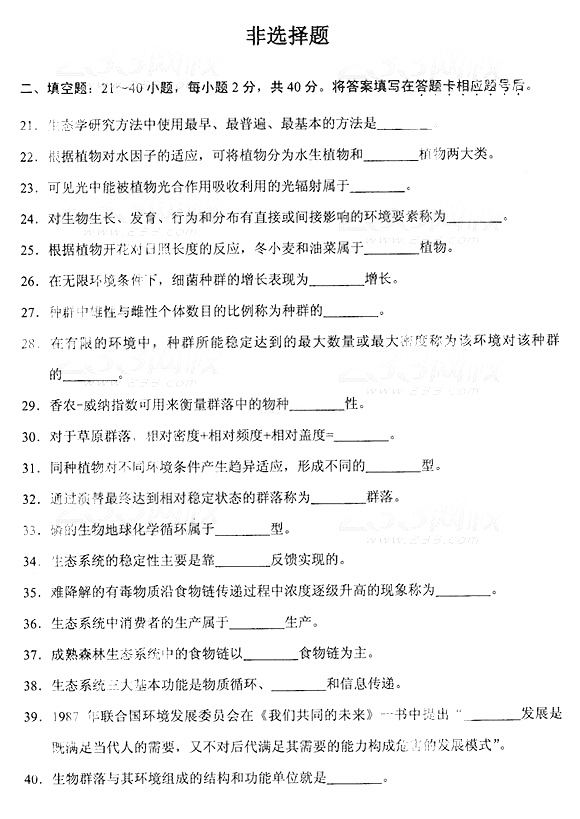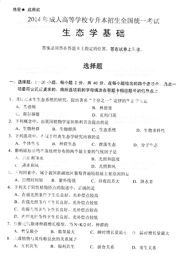 2014年成人高考专升本《生态...