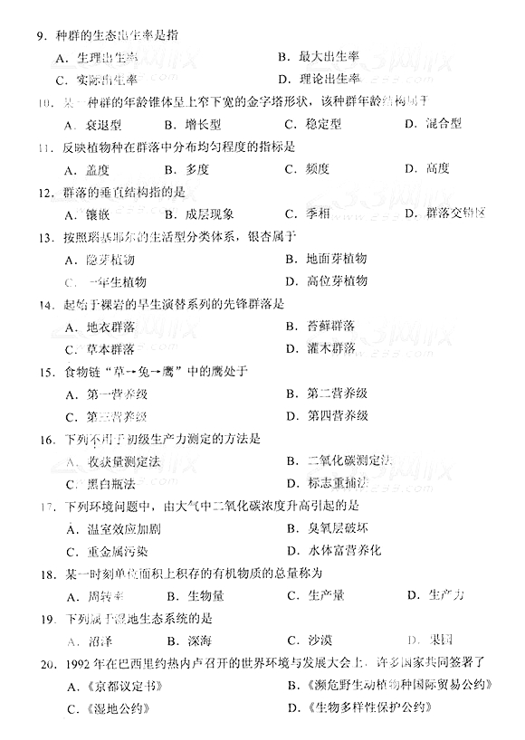 2014年成人高考专升本《生态学基础》真题及答案